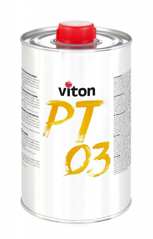 PT 03 is intended to adjust the viscosity of VITON paints applied by a spray gun, a brush or a roller. The quantity of thinner depends on the chosen type of application, on the temperature and on the type of chosen paint. The maximal quantity is specified in the technical data sheet of the particular paint. Mentioned thinner is intended only for coating materials and paints by VITON s.r.o. When applying a VITON paint combined with a thinner by another manufacturer the paint guarantee expires.
